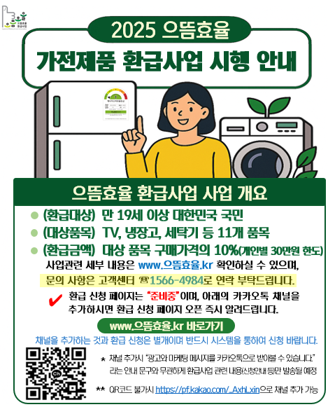 이번 으뜸효율환급사업은 단순한 할인 이상의 혜택을 제공합니다. 1등급 가전을 구매하면 전기 절약은 물론, 현금 환급까지 받을 수 있는 1석 2조의 기회입니다. 사업 예산이 넉넉하지만, 예년 사례를 보면 조기 소진되는 경우도 있으니 서둘러 신청하는 것이 좋습니다.