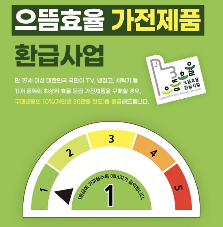 ‘으뜸효율환급사업’은 에너지 소비효율 1등급 가전제품 구매 시, 구매금액의 10%를 환급해주는 정부 지원정책입니다. 개인당 최대 30만 원 한도로 지원되며, 만 19세 이상 대한민국 국민이라면 누구나 참여할 수 있습니다.