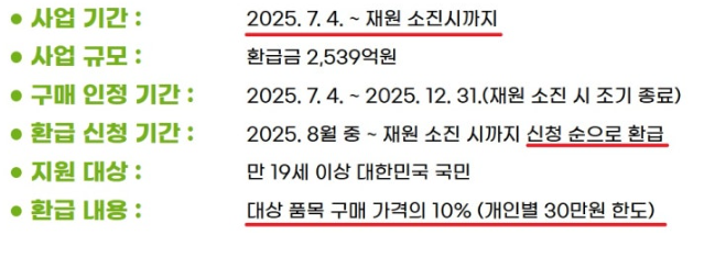 - 사업 기간: 2025년 7월 4일부터 재원 소진 시까지 - 구매 인정 기간: 2025년 7월 4일 ~ 12월 31일 (재원 소진 시 조기 종료) - 신청 기간: 2025년 8월부터 신청 페이지 오픈 후 선착순 접수