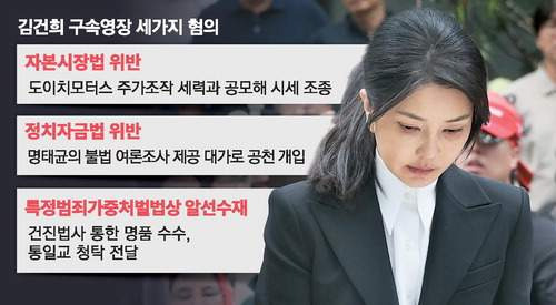 - 주요 혐의: 자본시장법 위반(도이치모터스 주가조작), 정치자금법 위반(명태균 공천개입 의혹), 특정범죄가중처벌법상 알선수재(건진법사·통일교 청탁)