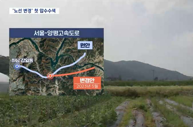 2021년 예비타당성 조사를 통과한 기존 노선(양서면)이 突如 2023년 5월 국토부에 의해 보류되었고, 김건희 여사 일가가 토지를 보유한 강상면 노선이 새롭게 부상하면서 국민적 의혹이 확산되었습니다.