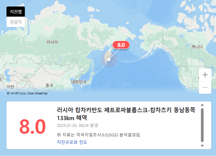 | 오전 11:24 | 8.0 | 캄차카반도 동남쪽 136km | 19km |