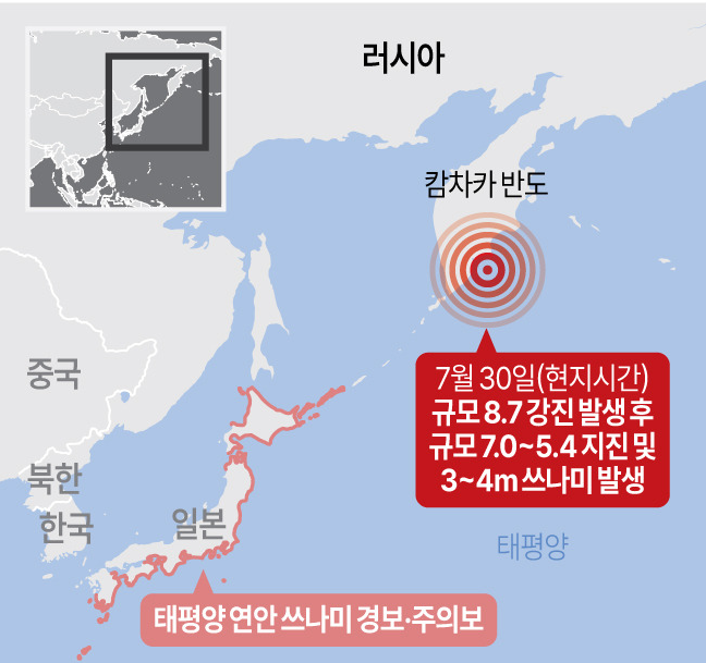 - ✔ 러시아 캄차카 해역에서 규모 8.7의 초강진 발생