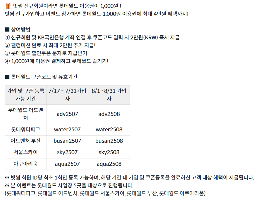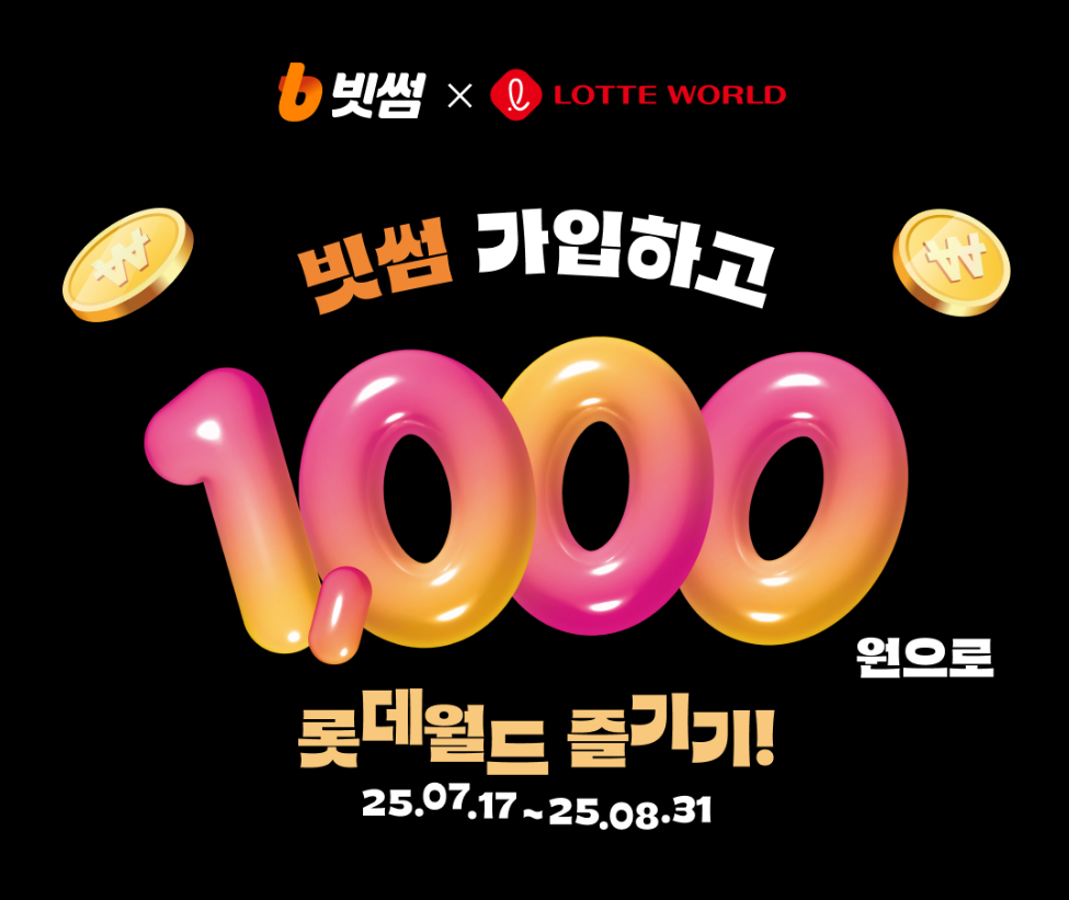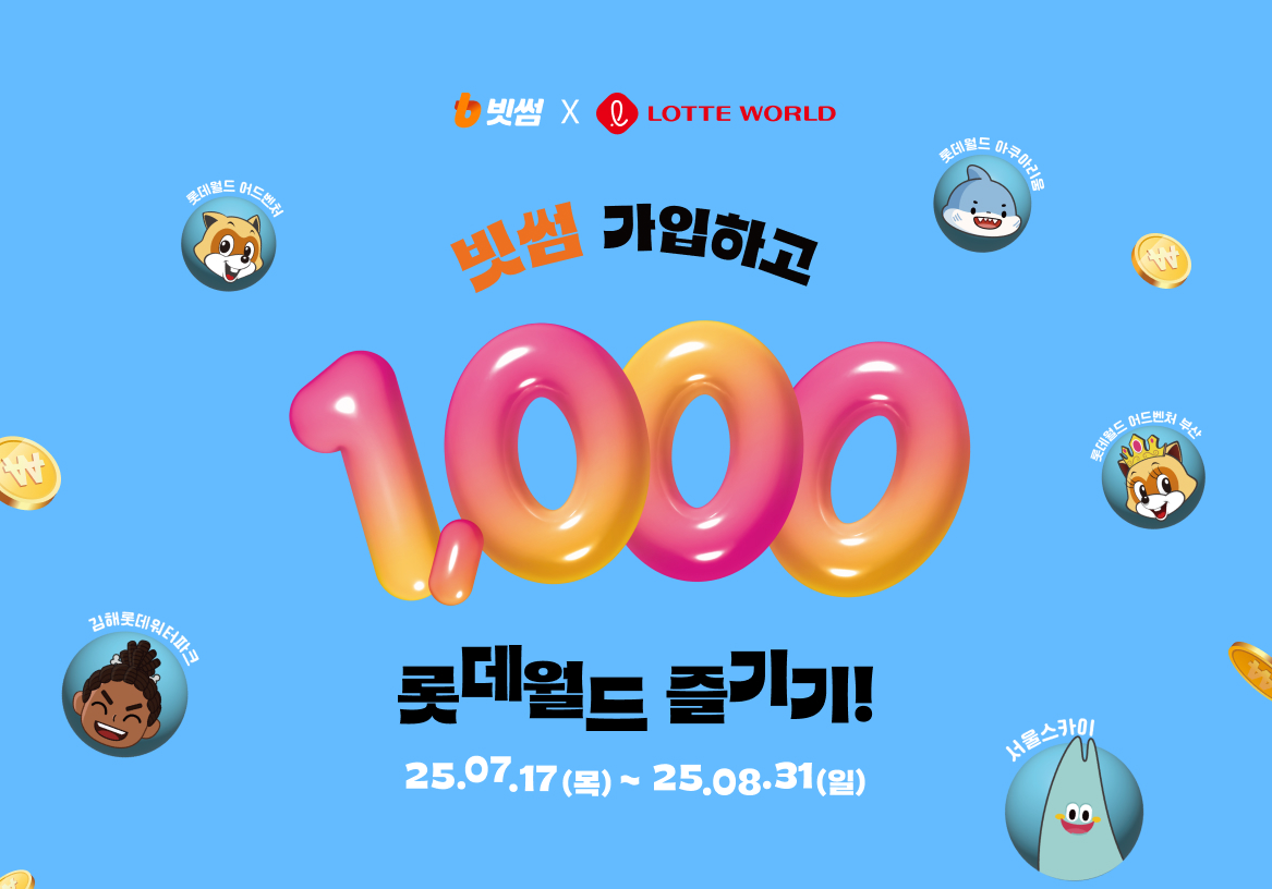 2025년 여름휴가, 1,000원으로 롯데월드 풀코스를 즐길 수 있는 절호의 기회! 빗썸 신규가입 혜택과 리워드까지 더하면 총 40,000원 + 63,000원 할인 효과를 누릴 수 있어요.