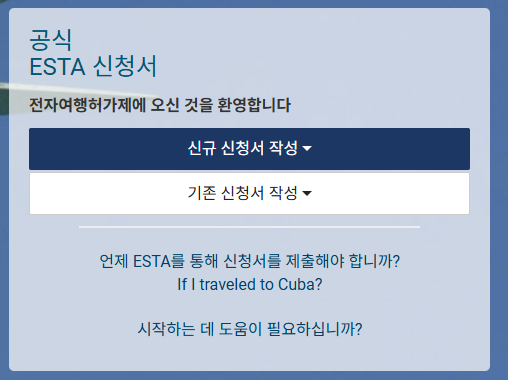 ESTA 공식 웹사이트에 접속합니다. 가짜 사이트에 접속하지 않도록 주의하세요. 한국어 지원이 되니, 한국어로 변경 후 시작하는 것이 좋습니다.