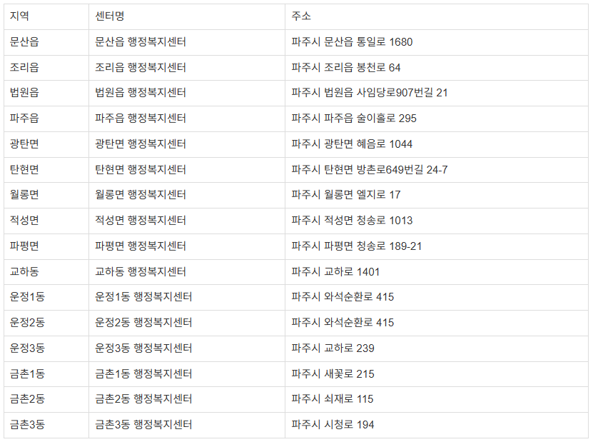 방문 신청은 아래 각 행정복지센터로 방문하여 신청하시기 바랍니다.