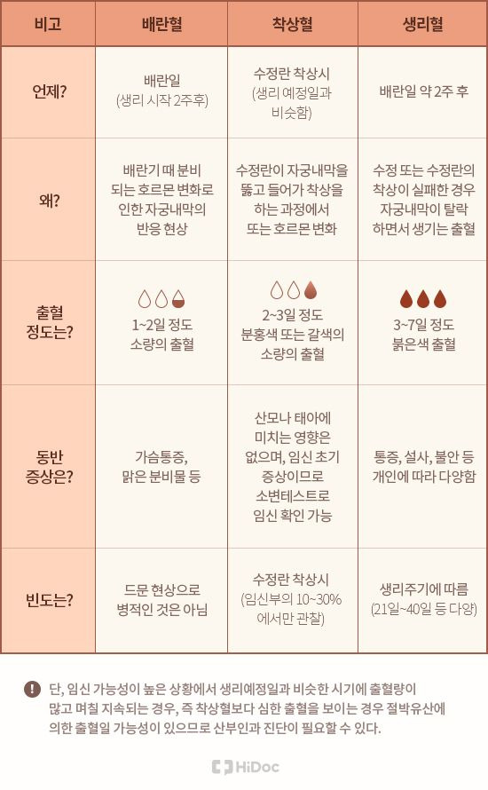 | 구분 | 배란혈 | 착상혈 | 부정출혈 |