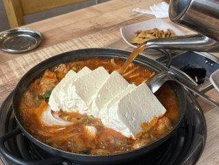 돼지고기 특유의 잡내 없이 깔끔하고 얼큰한 국물은 자극적이지 않으면서도 진한 풍미를 선사하며, 밥 위에 국물과 고기, 김치, 두부를 함께 비벼 먹는 것은 단골들이 즐겨 찾는 최고의 조합이에요.