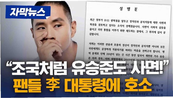 2025년 8월 9일, 디시인사이드 '유승준 갤러리' 팬들은 성명문을 발표하며 "정치인과 공직자만 사면하는 것은 형평성에 어긋난다"고 주장했습니다. 조국 전 대표와 윤미향 전 의원 사례를 언급하며, 국민 통합 논리가 특정 집단이 아닌 모든 국민에게 동일하게 적용돼야 한다는 입장을 강조했습니다.