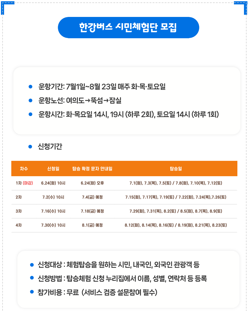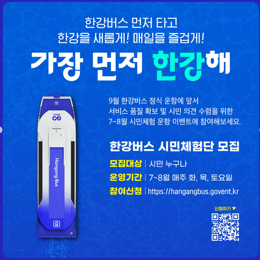A. 공식 누리집 hangangbus.govent.kr 통해 신청 가능. 회차별 문자 안내