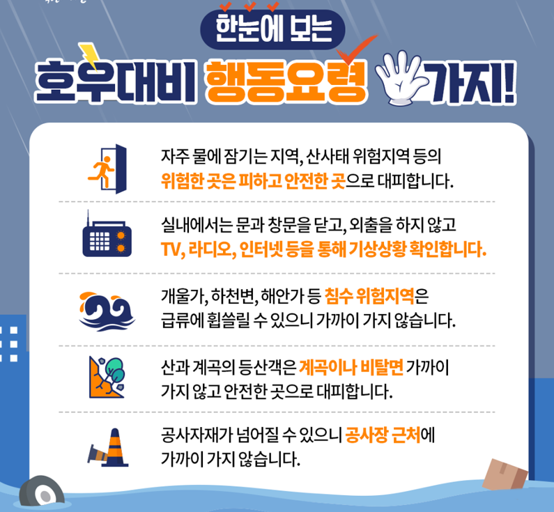 📌 저지대, 지하 공간은 침수 위험이 높기 때문에 미리 대비하고 대비물품 준비를 해두시는 게 좋아요.