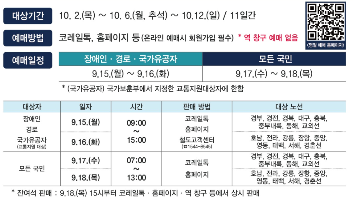 - 9월 17일: 경부선, 경전선, 동해선 등 경상권 노선 예매가 가능해요.